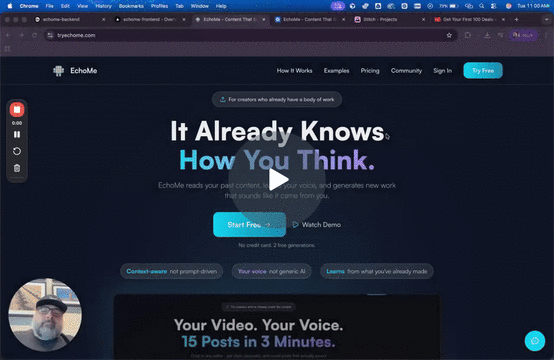 ChatGPT writes from prompts. Echo writes from context - your history, your voice, your ideas. No prompt engineering. No “act like me” instructions.